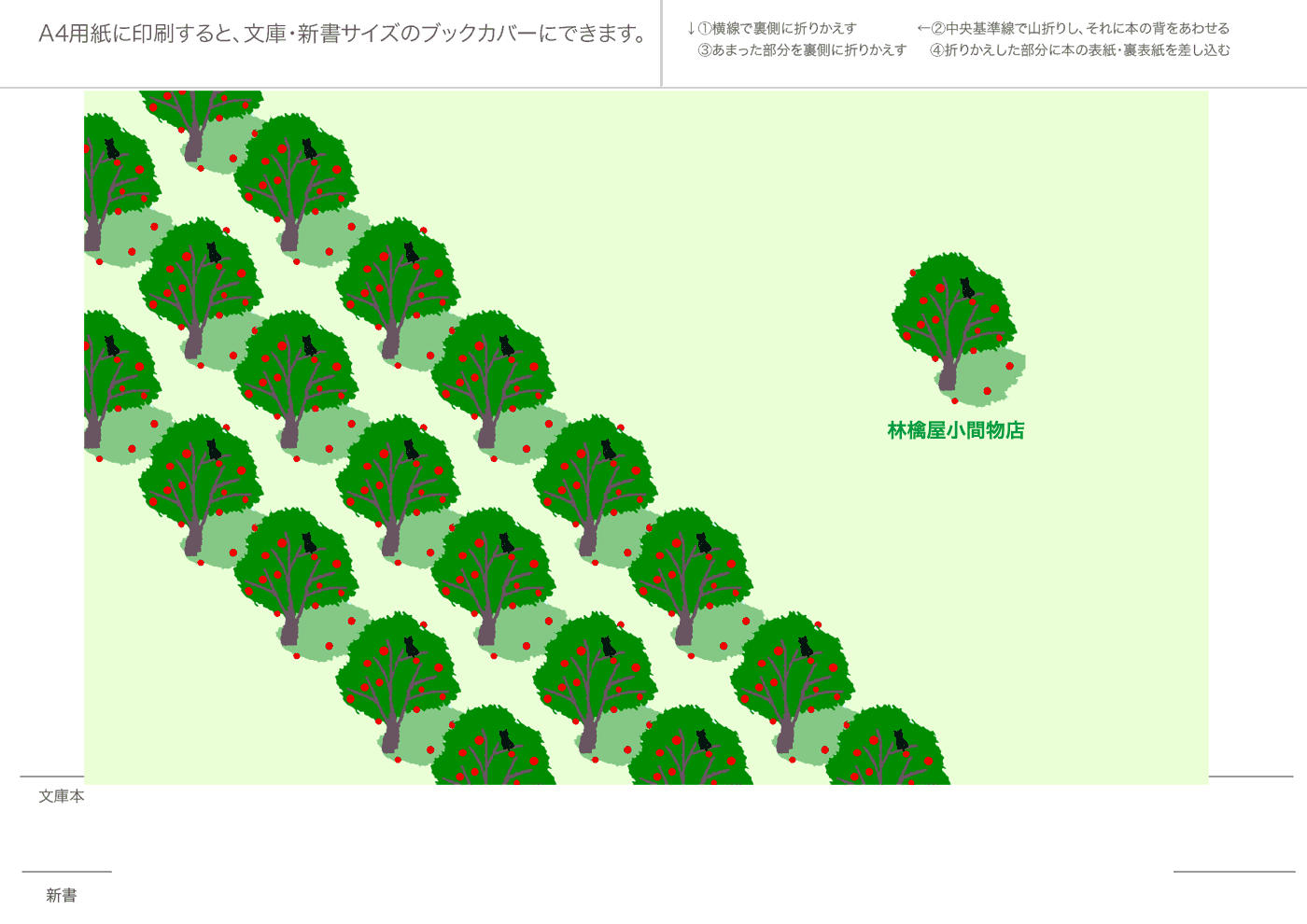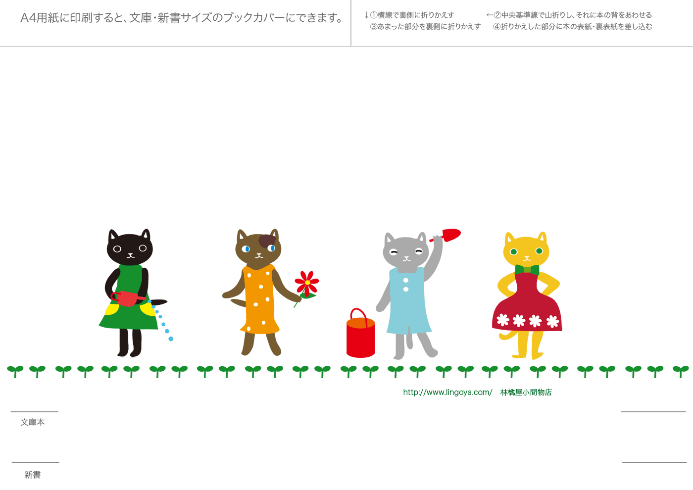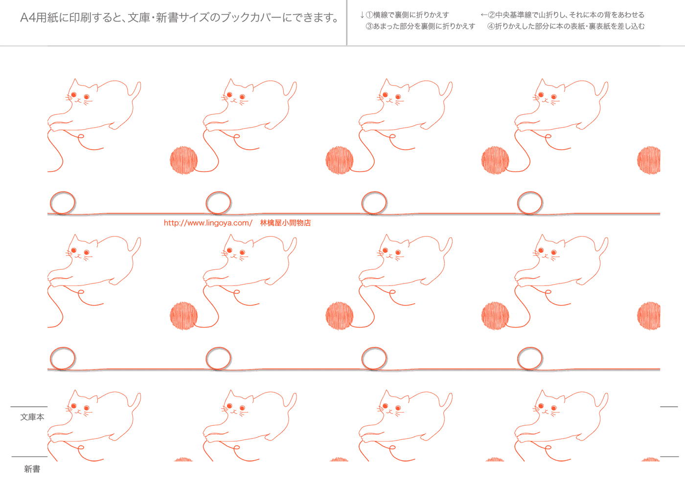 文庫本・新書本用カバーです。GIF形式を縮小表示しています。ダウンロードし、A4用紙に印刷してご利用ください。フチなし印刷を推奨。和風模様は、少し透けたパソコン和紙(A-oneの白霞とか)に印刷するとすてきです。なかにはインクを消費気味のものもあります、すいません。インクジェットで印刷すると、本をお風呂に持ち込むとにじみます(苦笑)