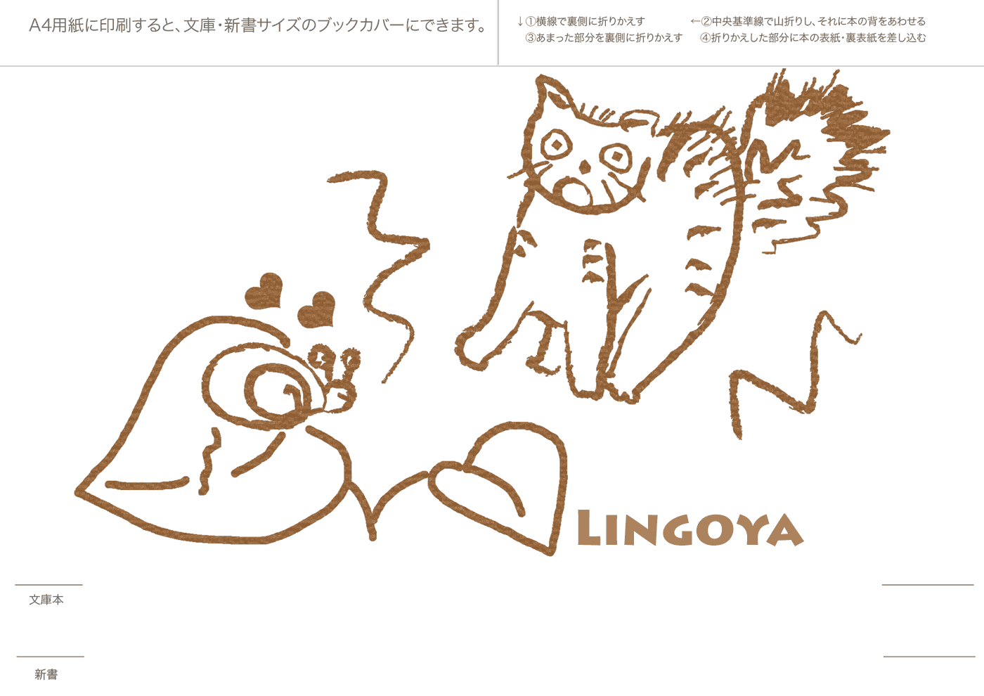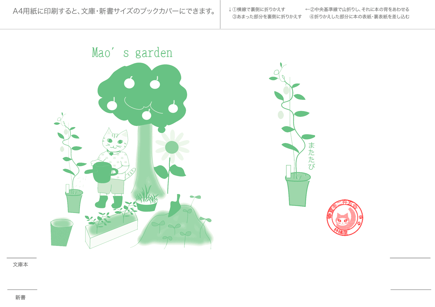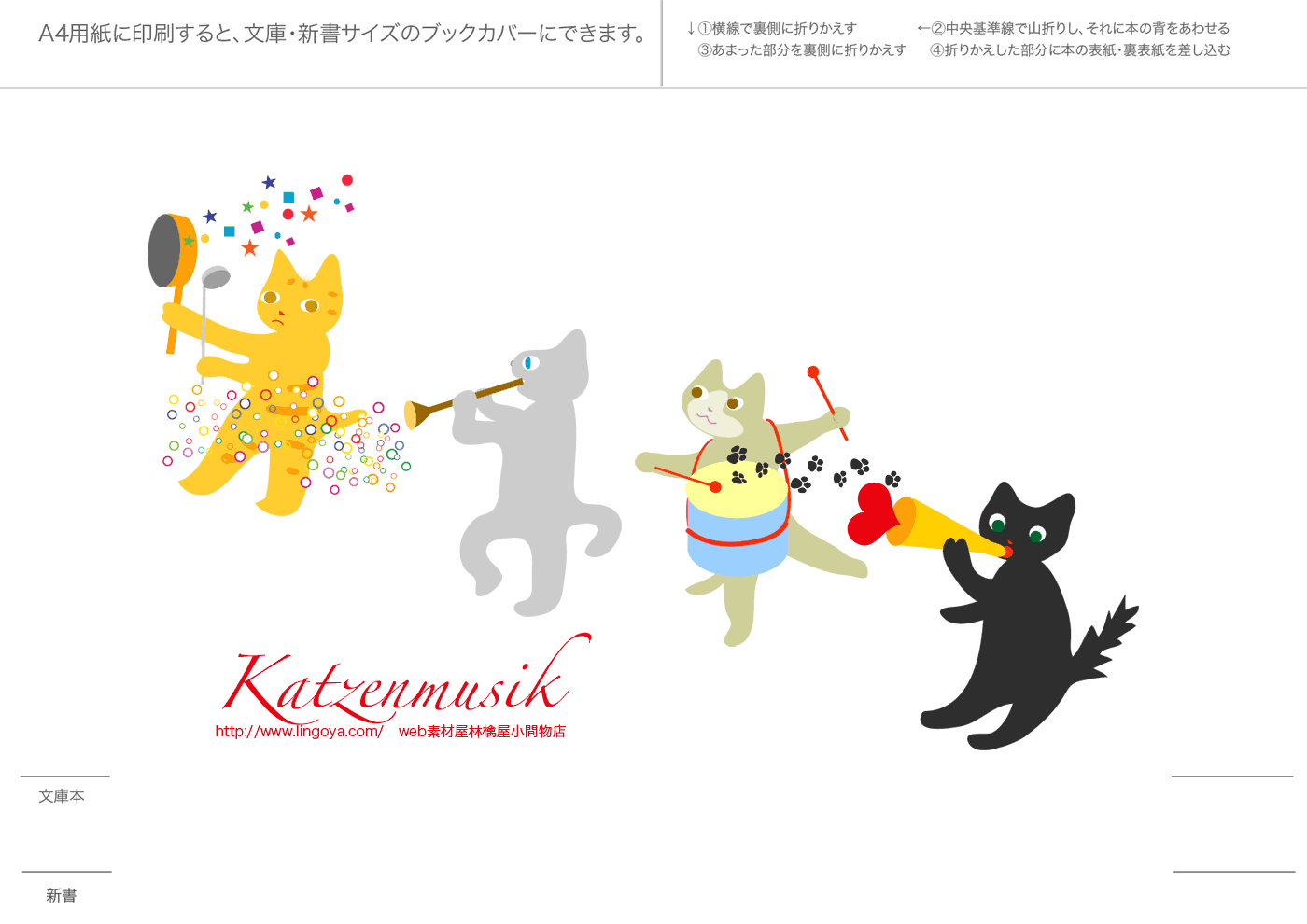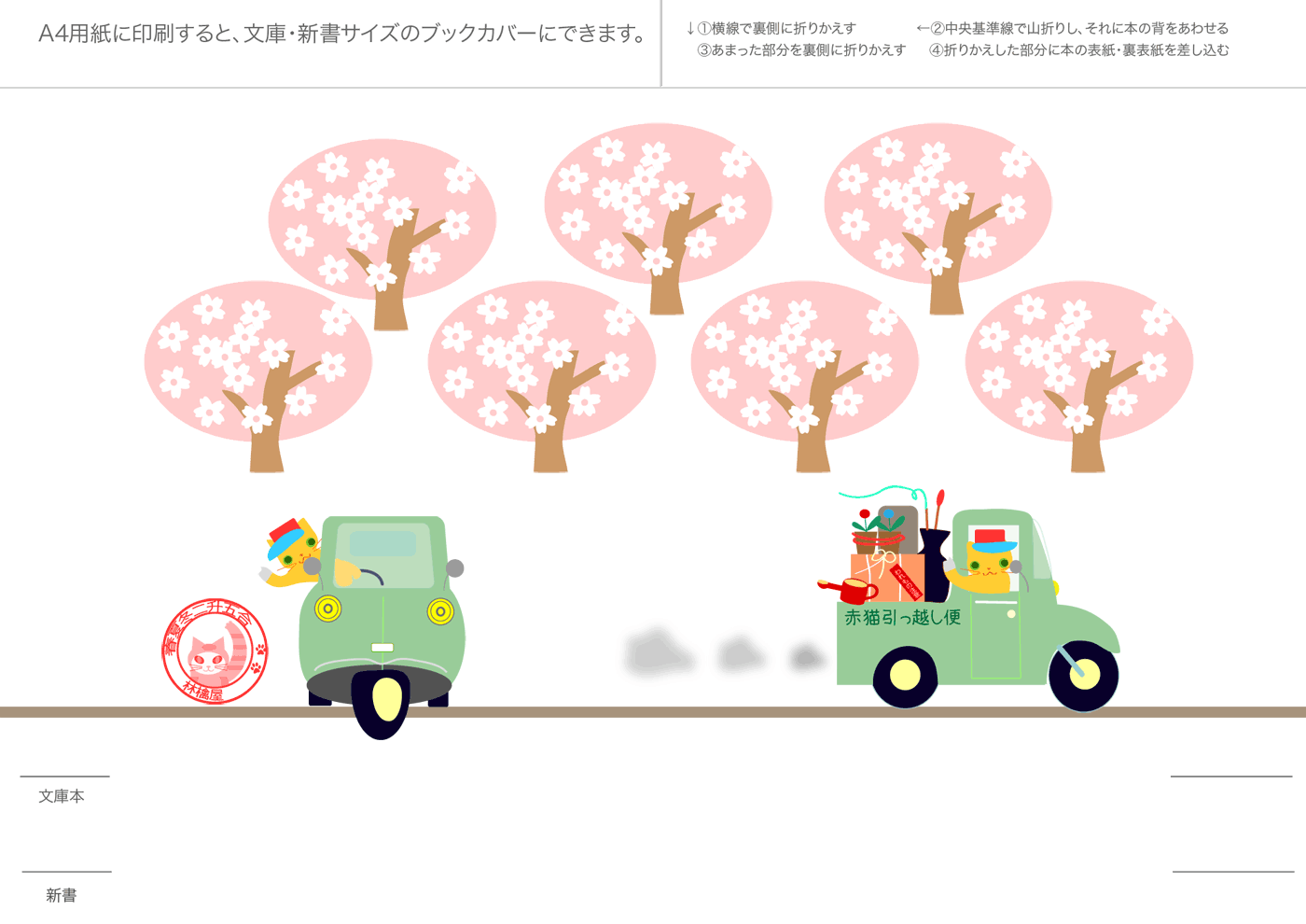 文庫本・新書本用カバーです。GIF形式を縮小表示しています。ダウンロードし、A4用紙に印刷してご利用ください。フチなし印刷を推奨。和風模様は、少し透けたパソコン和紙(A-oneの白霞とか)に印刷するとすてきです。なかにはインクを消費気味のものもあります、すいません。インクジェットで印刷すると、本をお風呂に持ち込むとにじみます(苦笑)