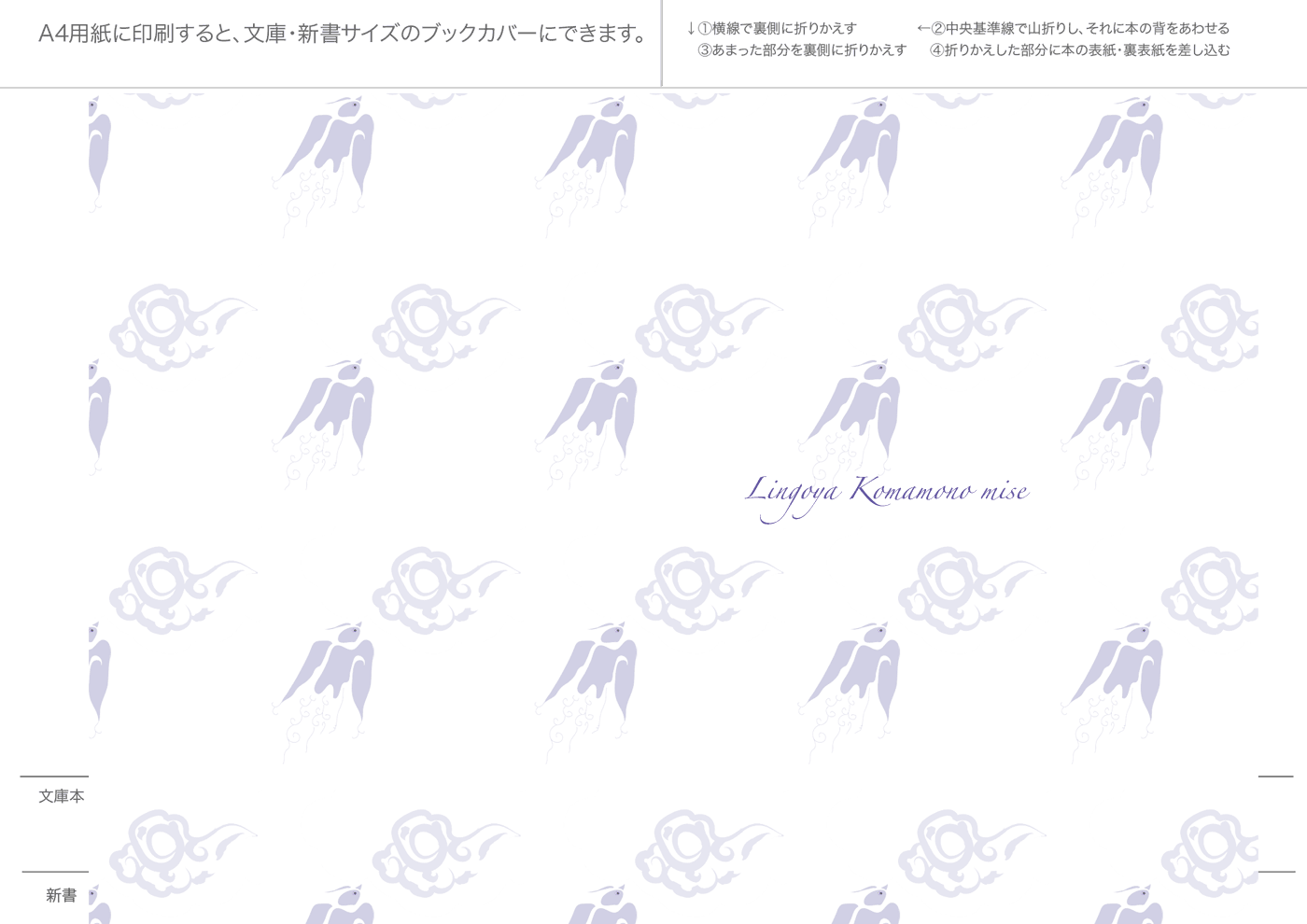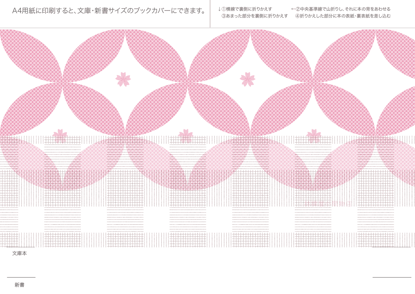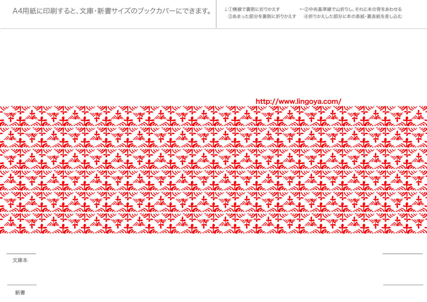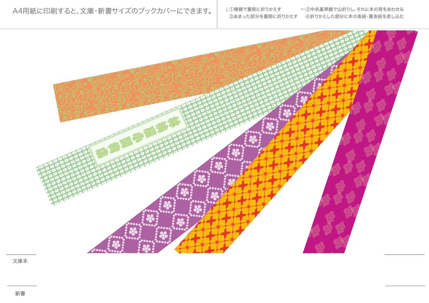 文庫本・新書本用カバーです。GIF形式を縮小表示しています。ダウンロードし、A4用紙に印刷してご利用ください。フチなし印刷を推奨。和風模様は、少し透けたパソコン和紙(A-oneの白霞とか)に印刷するとすてきです。なかにはインクを消費気味のものもあります、すいません。インクジェットで印刷すると、本をお風呂に持ち込むとにじみます(苦笑)