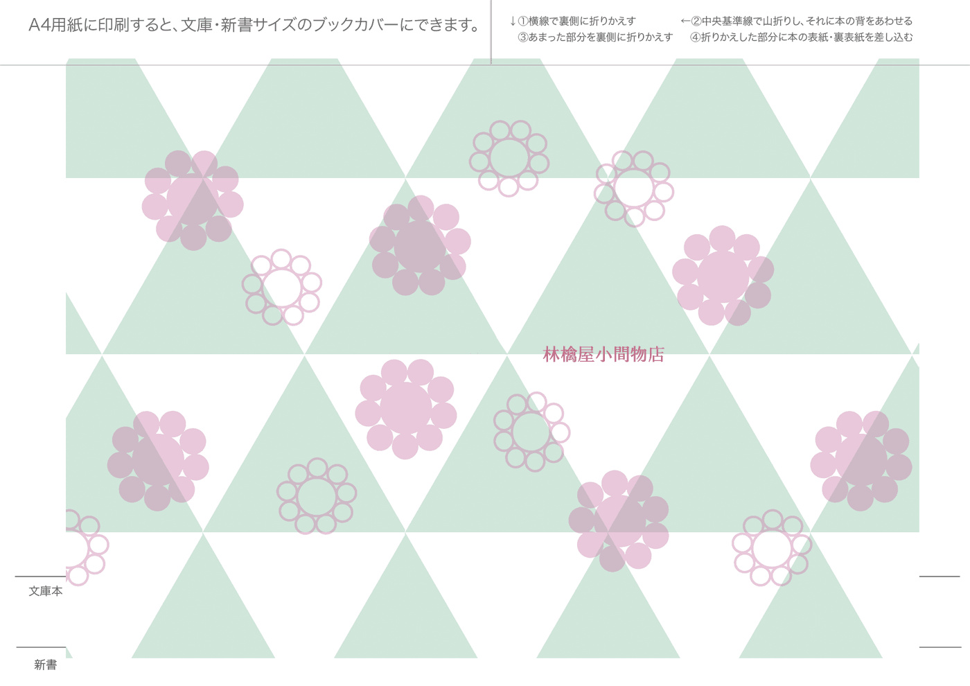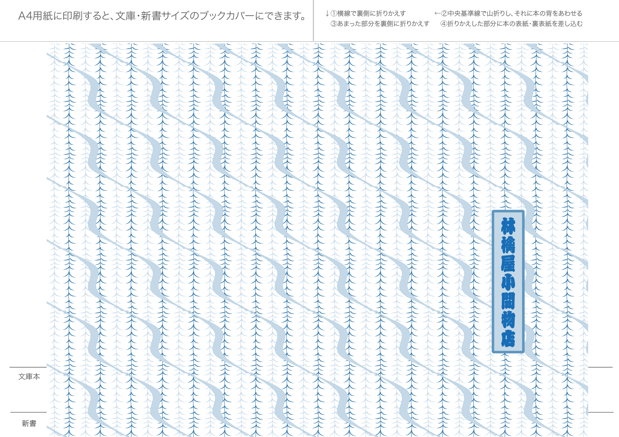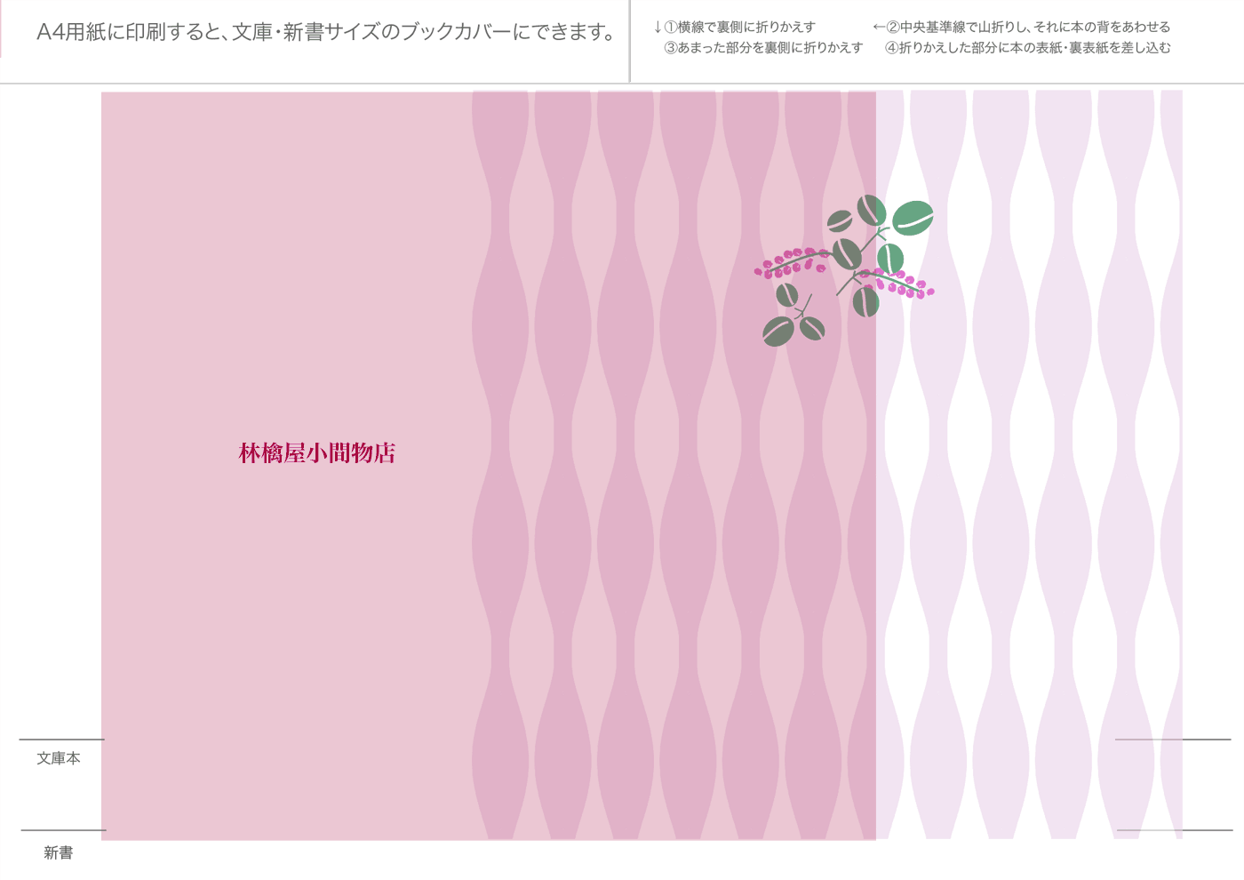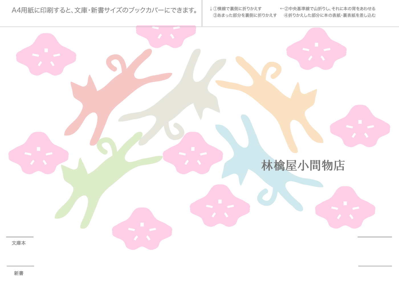 文庫本・新書本用カバーです。GIF形式を縮小表示しています。ダウンロードし、A4用紙に印刷してご利用ください。フチなし印刷を推奨。和風模様は、少し透けたパソコン和紙(A-oneの白霞とか)に印刷するとすてきです。なかにはインクを消費気味のものもあります、すいません。インクジェットで印刷すると、本をお風呂に持ち込むとにじみます(苦笑)