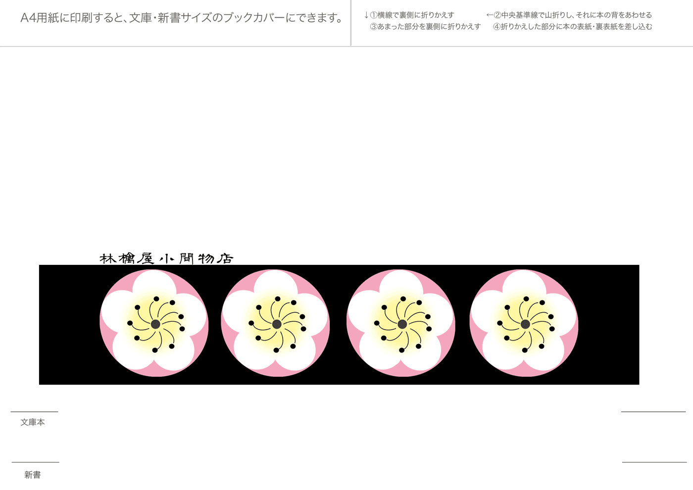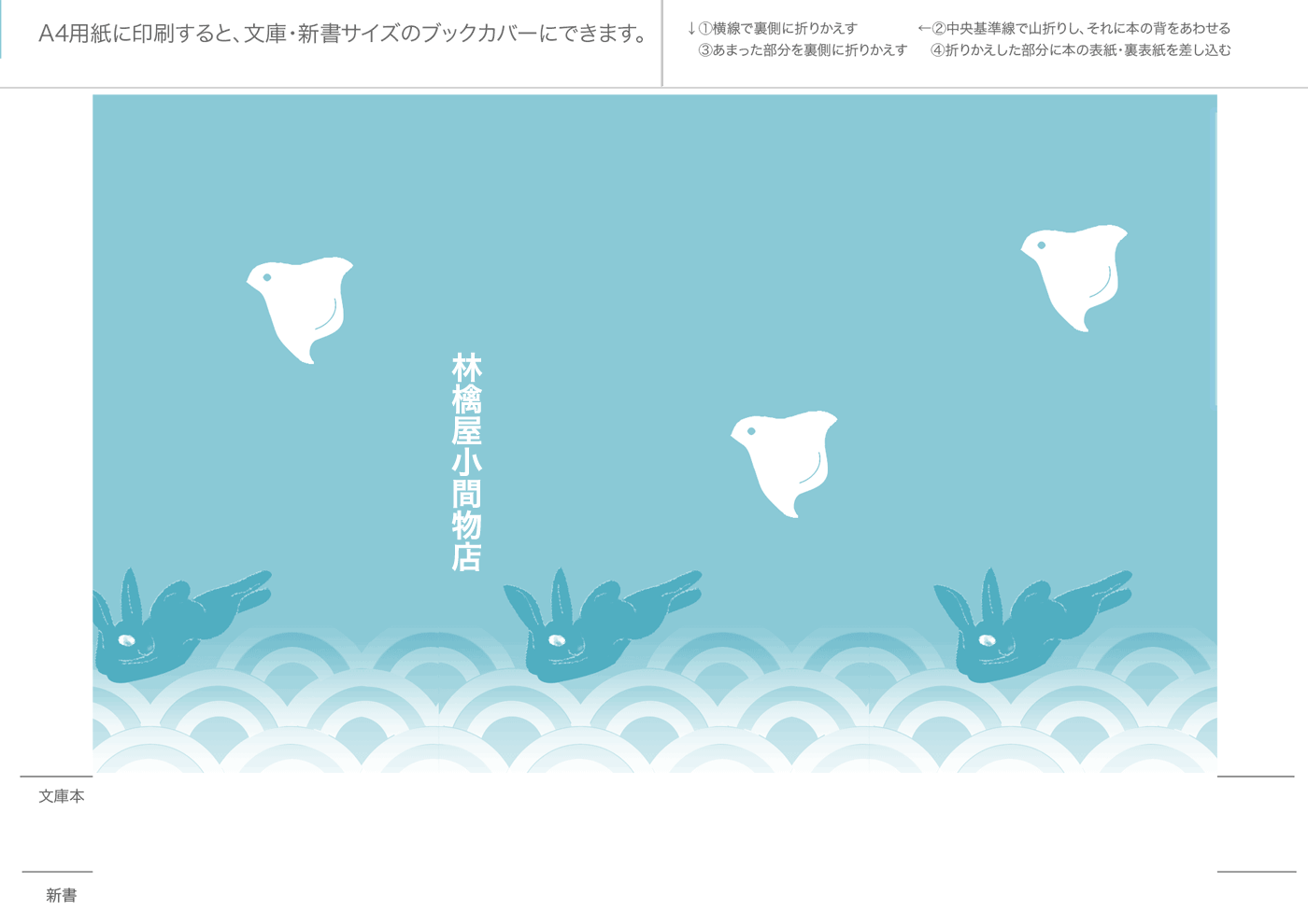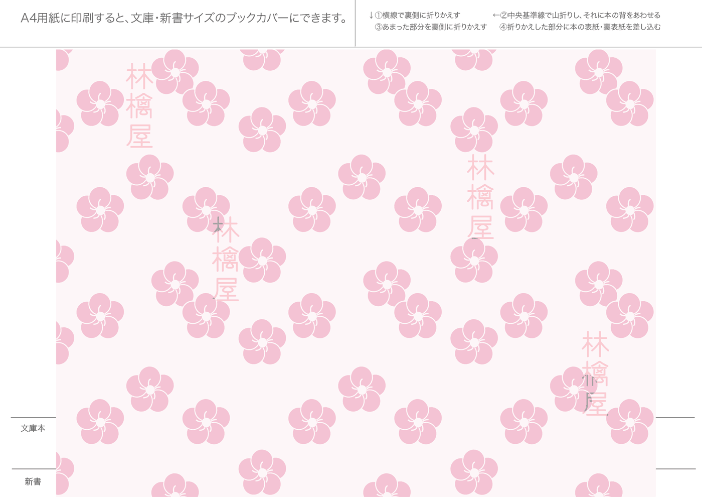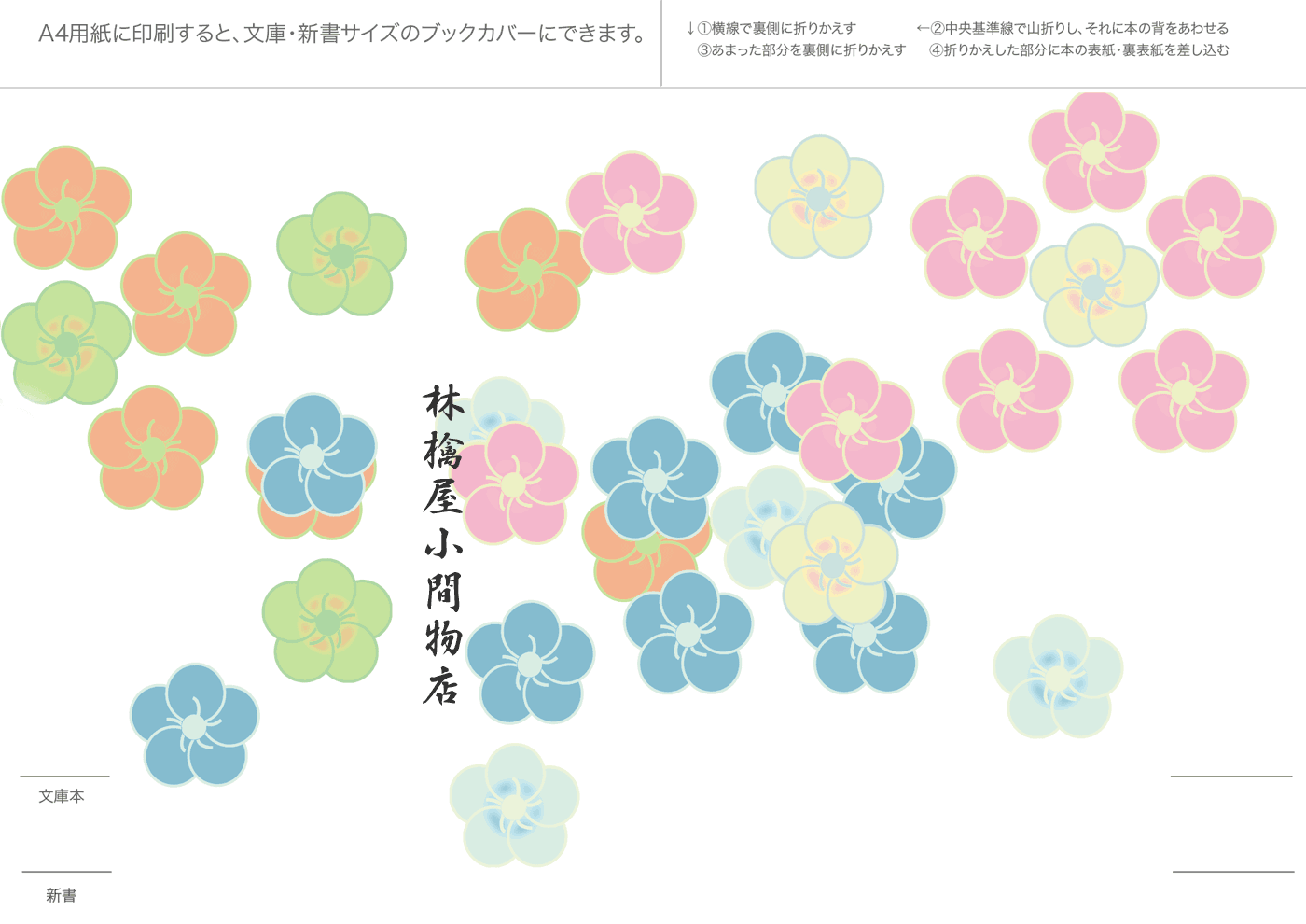 文庫本・新書本用カバーです。GIF形式を縮小表示しています。ダウンロードし、A4用紙に印刷してご利用ください。フチなし印刷を推奨。和風模様は、少し透けたパソコン和紙(A-oneの白霞とか)に印刷するとすてきです。なかにはインクを消費気味のものもあります、すいません。インクジェットで印刷すると、本をお風呂に持ち込むとにじみます(苦笑)