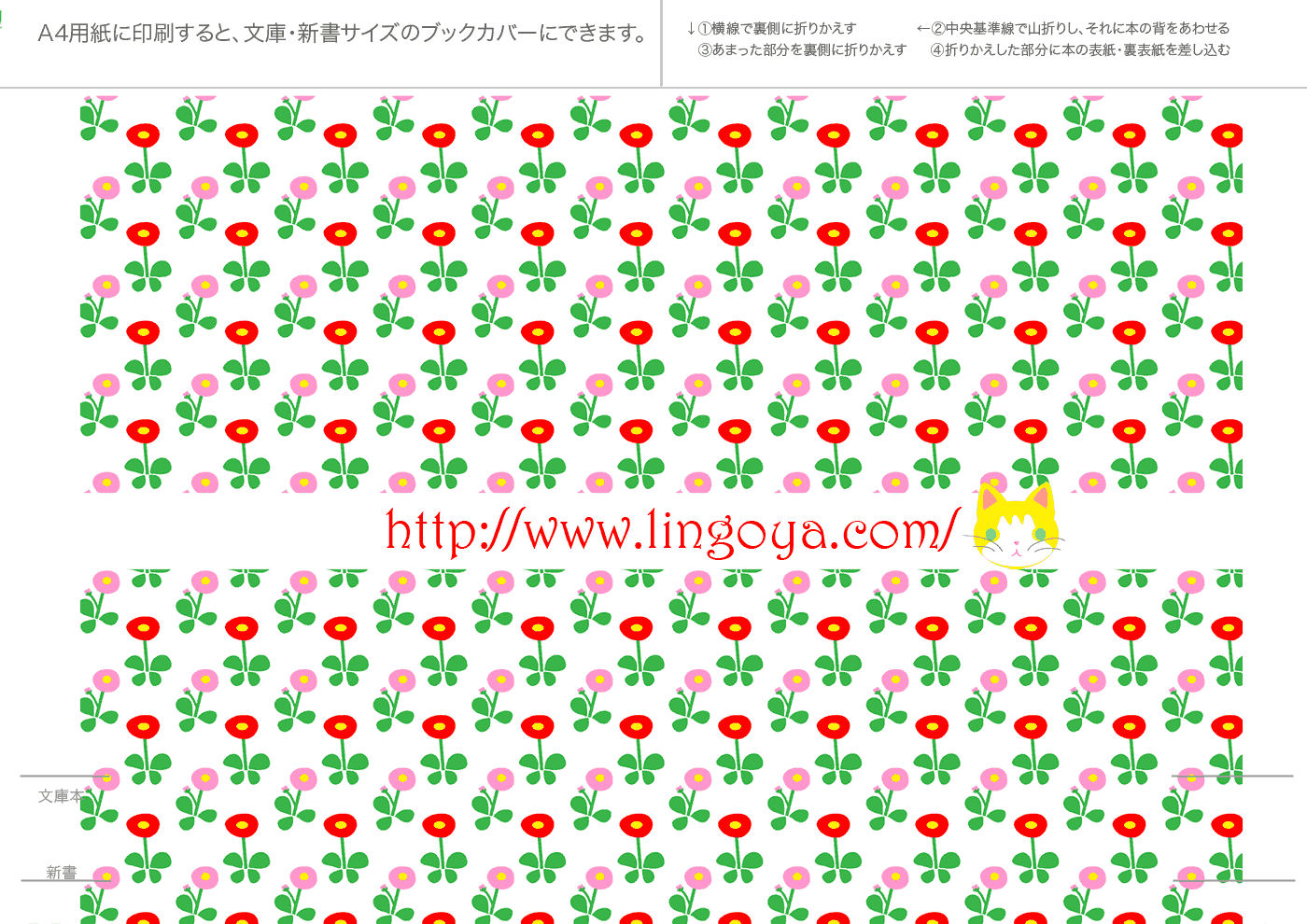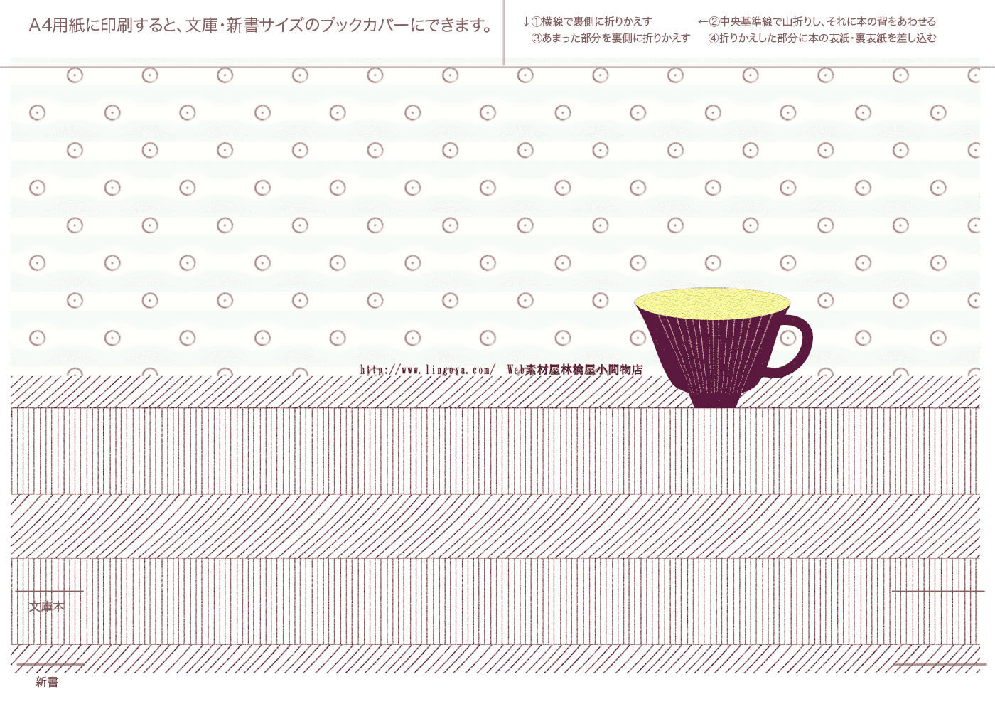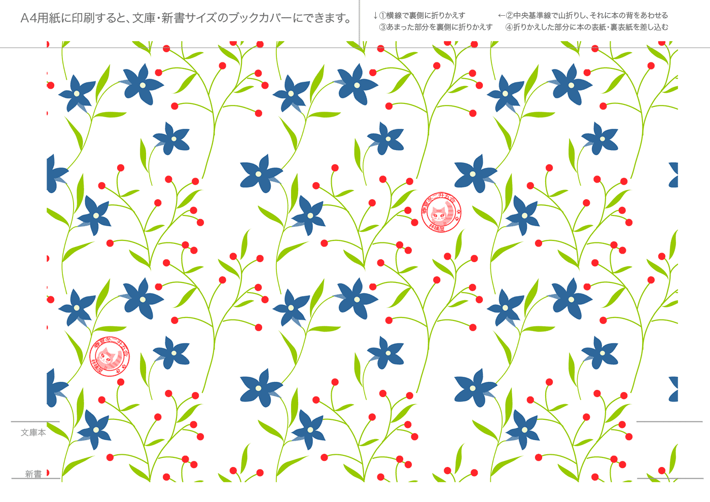 文庫本・新書本用カバーです。GIF形式を縮小表示しています。ダウンロードし、A4用紙に印刷してご利用ください。フチなし印刷を推奨。和風模様は、少し透けたパソコン和紙(A-oneの白霞とか)に印刷するとすてきです。なかにはインクを消費気味のものもあります、すいません。インクジェットで印刷すると、本をお風呂に持ち込むとにじみます(苦笑)