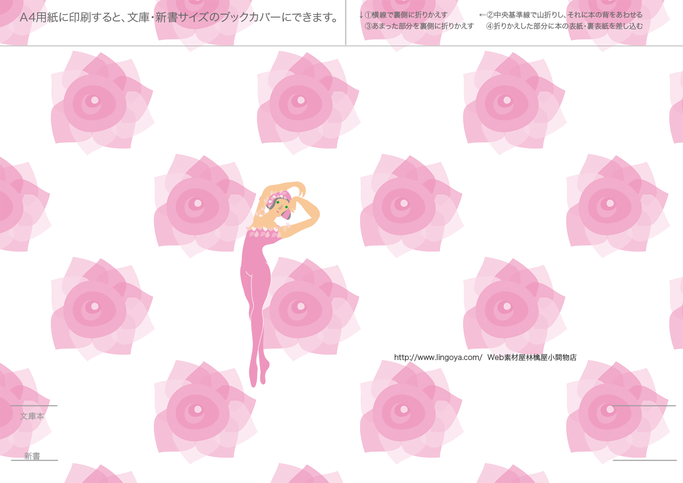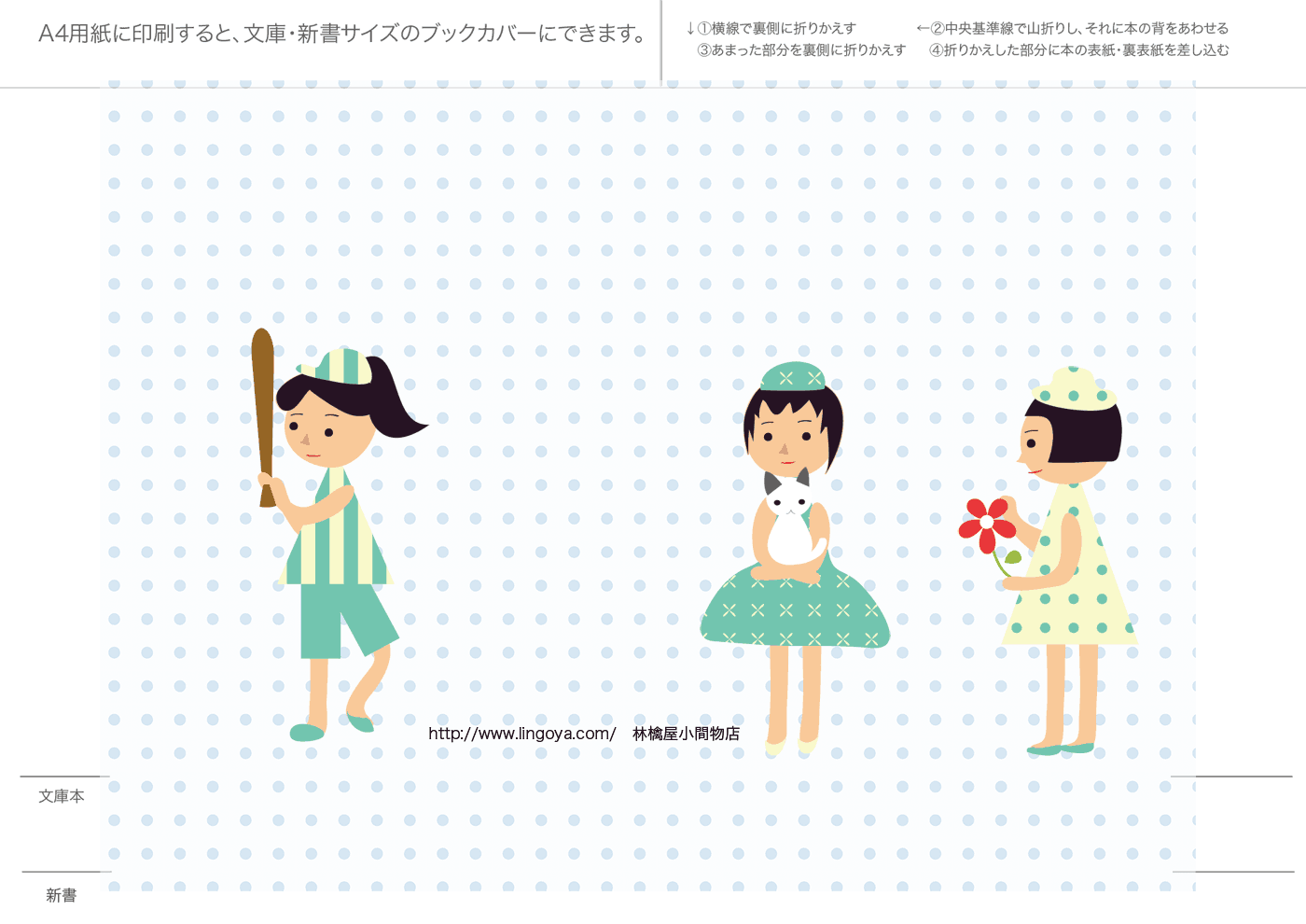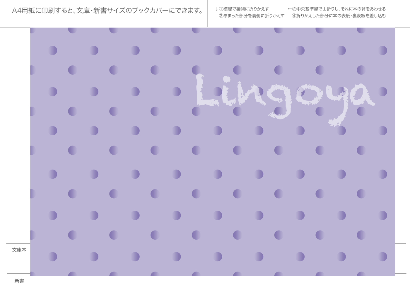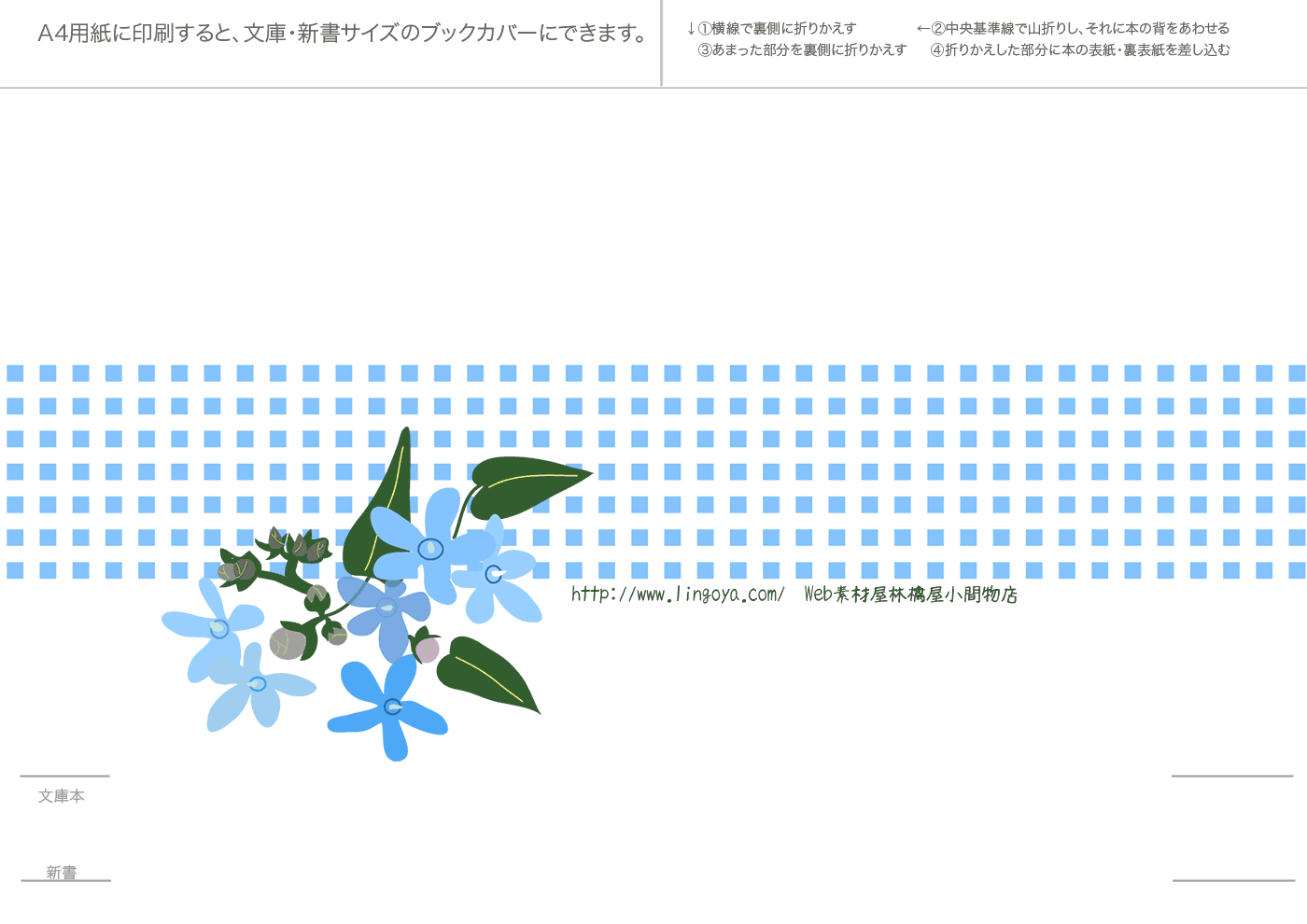 文庫本・新書本用カバーです。GIF形式を縮小表示しています。ダウンロードし、A4用紙に印刷してご利用ください。フチなし印刷を推奨。和風模様は、少し透けたパソコン和紙(A-oneの白霞とか)に印刷するとすてきです。なかにはインクを消費気味のものもあります、すいません。インクジェットで印刷すると、本をお風呂に持ち込むとにじみます(苦笑)