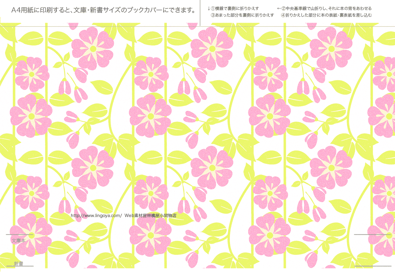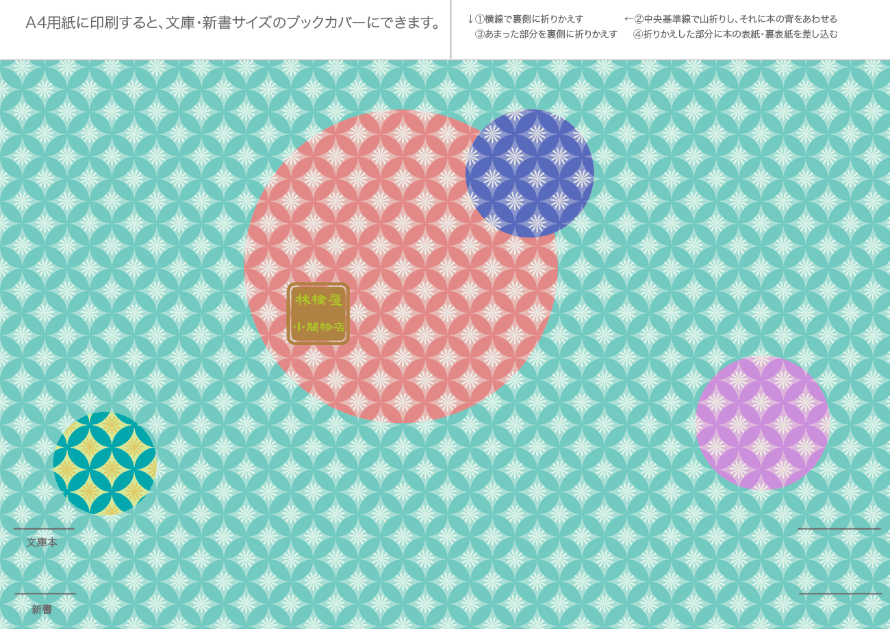 文庫本・新書本用カバーです。GIF形式を縮小表示しています。ダウンロードし、A4用紙に印刷してご利用ください。フチなし印刷を推奨。和風模様は、少し透けたパソコン和紙(A-oneの白霞とか)に印刷するとすてきです。なかにはインクを消費気味のものもあります、すいません。インクジェットで印刷すると、本をお風呂に持ち込むとにじみます(苦笑)