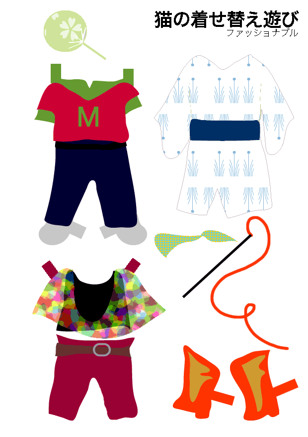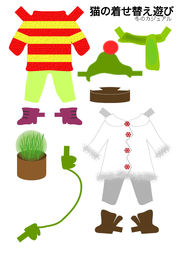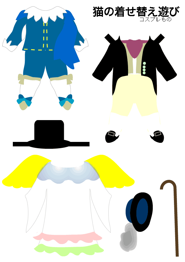 しゃれで、昔なつかしい着せ替えを作ってみました。GIFファイルをダウンロードし、A4用紙に、できればフチなしで印刷してください。本体の猫と衣装類を切り取って、お遊びください。猫本体と夏のカジュアル冬のカジュアルコスプレファッショナブル