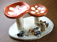 鶏肋窯製アクセサリーレスト。きのこの下で、またたびコーヒーもあって、のんびりお昼寝。