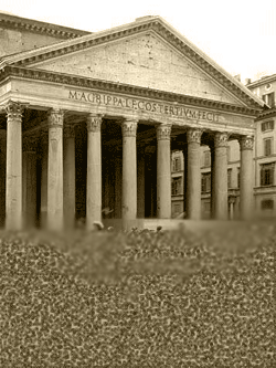 ローマパルテノン神殿の前にたたずむトーガを着用したローマ貴族。光文堂文庫から出ているファルコのシリーズによると、とっても着るのがめんどくさいそうです。
