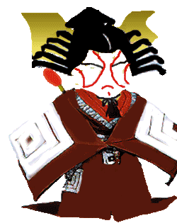 」。元禄時代に初代市川団十郎が演じたとのことで、歴史も古い。悪いやつが罪なき人を殺そうとすると、そこに「暫(しばら)く」と声をかけてかっこよく鎌倉権五郎景政が登場、悪をこらしめる。へんな髪型に侍烏帽子・力紙、長素襖に大太刀がわりの猫じゃらし。