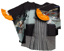 金屏風の前、羽織・袴で扇持って踊る猫。やはり猫じゃ猫じゃを踊るのでしょうか。羽織は振り袖です。