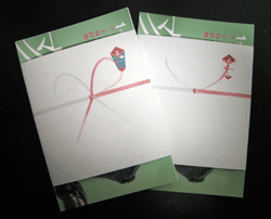 こののし紙には、水引と熨斗(のし)が書かれている。水引は、慶事・弔事の進物に細長い紙を帯のように巻いた帯紙が変化し、こよりに糊水を引くようになったことから、水引と言われるようになった。祝儀には、金銀・金紅・紅白など(右側が紅)、不祝儀には銀白・双銀・黒白・青白などの水引が使われる。色は水引の結び方は、上の写真の左のような蝶結び(花結び)と、右の結び切り(固結び)とに大きく分けられる。蝶結びは、何度もほどくことが出来るので、繰り返されて欲しいの意を込め、逆に弔事や結婚式や退院祝などはこれ1回であって欲しいとの願いから結び切りが使われることもある。またあわび結びは、結び目が複雑に絡み合っていて、解うとすれば解けるが容易には解けない意味合いと、互いの輪が互いに結び合っていて長生きと長持ちのしるしとして昔から重宝がられた鮑の形に似ている事から、末永い付き合いをとの願を込め、慶事と弔事の双方に用いられる。