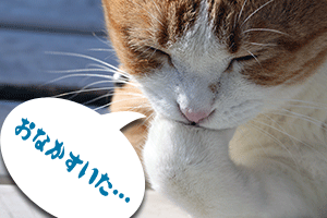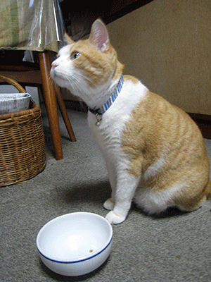ある日、お鉢のカリカリがとても少なくなった。昼前にはもう一粒もない。あまりの悲しさに、空のお鉢の前でうなだれる。そっとないてみる。