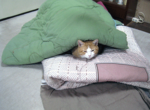 ぼく専用のコタツはあるが、これは上に乗って昼寝するためのもの。森羅万象について思いめぐらすには大きなコタツの中にもぐる方がいい。ヒーターが熱すぎるときは、コタツの横の方に寄る。これには危険がある。そそっかしい里親に時々踏みつけられ、痛い思いをする。