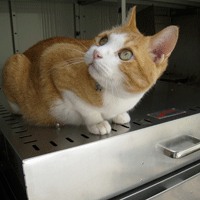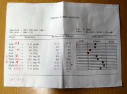 暑さのせいか、食欲がない。それになんだか吐き気がする。4日連続でカーペットの上に吐き散らしたので、里親はぼくの腹を見て、「ストレスかな」。診察台の上では、ぼくはひたすら頭を低くして、恭順する。先生「とても猫柄のよい猫ですね」。