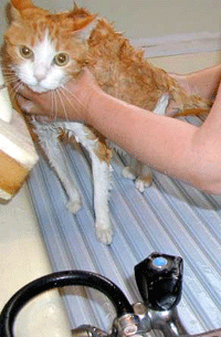 浴室に閉めこまれ、抵抗むなしく、風呂フタの上においつめられ。シャンプだらけになり。何とも面目ない。美しく清潔な猫なんて、人間を楽しませるためのもの。猫としてのプライドや喜びも無視されて、ぼくは怒っている。