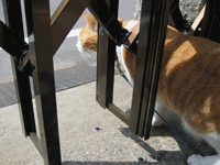 ある日里親が、門扉をつけようかと、ぼくに相談する。ぼくとしてはテリトリーの安全保障上、文句なく賛成する。そして、アコーディオン門扉がついた。野良猫なら出入自由だが、いつも通るセントバーナードはくぐれまい。一安心だ。隙間から首を出して大いに見聞を広めよう。体験学習は大切。