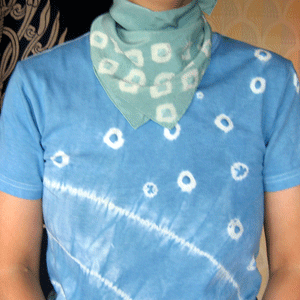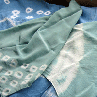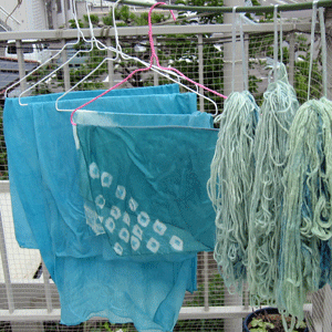 完成。木綿のTシャツに絹のスカーフ。絹と毛糸は、染液に漬ける時間を長くすると緑を帯びてきます。木綿のほうが青みは強い。