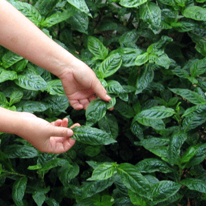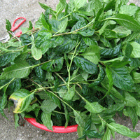タデ藍の葉を収穫する。2番葉をとる場合は、茎と葉を少々残しておく。葉の量は、染めたいものの重量の約2倍必要。