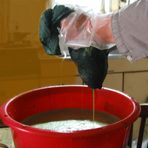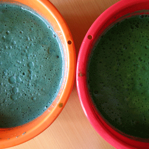 葉に水を加えてミキサーで粉砕する。水の量は多めにして、葉は少なめにしてさっと砕く。葉200グラムに水900シーシー程度らしい。絞り汁をむし布を縫って袋にしたものか、洗濯ネットの大きめのものでこして、絞汁を容器にためる。絞りかすは袋に残しておく。それを葉がなくなるまで繰り返す。