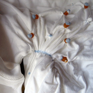 染めたいものの準備をする。布は水洗いしてのりを落とす。絞り染めをしたい場合は細工しておく。左はあずき豆を包んで輪ゴムと糸でとめ、糸で縫い縮めている。染める前に布は水につけて軽くしぼって、湿りけをのこしておく。