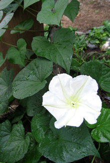 ![]() | ![]() | 「かんぴょう」を作ろうと、夕顔の種をまいた。頭のなかには久隅守景の絵があったはず。棚からぶらさがっているかんぴょうの実への期待がふくらんだ。思い違いはここから始まった。かんぴょうイコール夕顔、だが、夕顔イコールかんぴょうではない。私の夕顔は新来の「夜顔」だった。かんぴょうへの期待がしぼむ。これでは源氏物語の薄幸な夕顔の君ではなくなる。香をたきしめた白扇にのせて光源氏に差し出された夕顔の花が夜顔のはずがない。 尾形乾山の茶わんの夕顔をよく見ると、花びらに切り込みがある。これが本当の夕顔だ。たっぷりとした書体で記された「よりてだに露の光やいかにとも思いもわかぬ花の夕がほ」は、光源氏の本歌取りだそうだ。 かんぴょうは望めなくなったが、私の夕顔(夜顔)の花も、妖しく美しい。 |