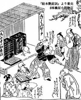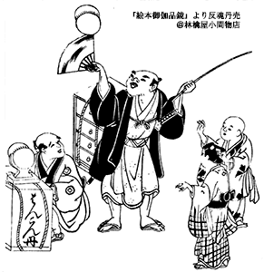 反魂丹売 291*300px 江戸の家庭薬といえば、「越中富山の反魂丹、はなくそ丸めて万金丹、それを呑む奴あんぽんたん」という地口があるくらい普及した反魂丹。富山の薬売が得意場を回って売ったが、芸をして売ることも行われたようだ。
